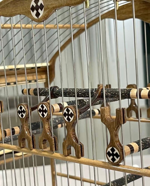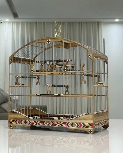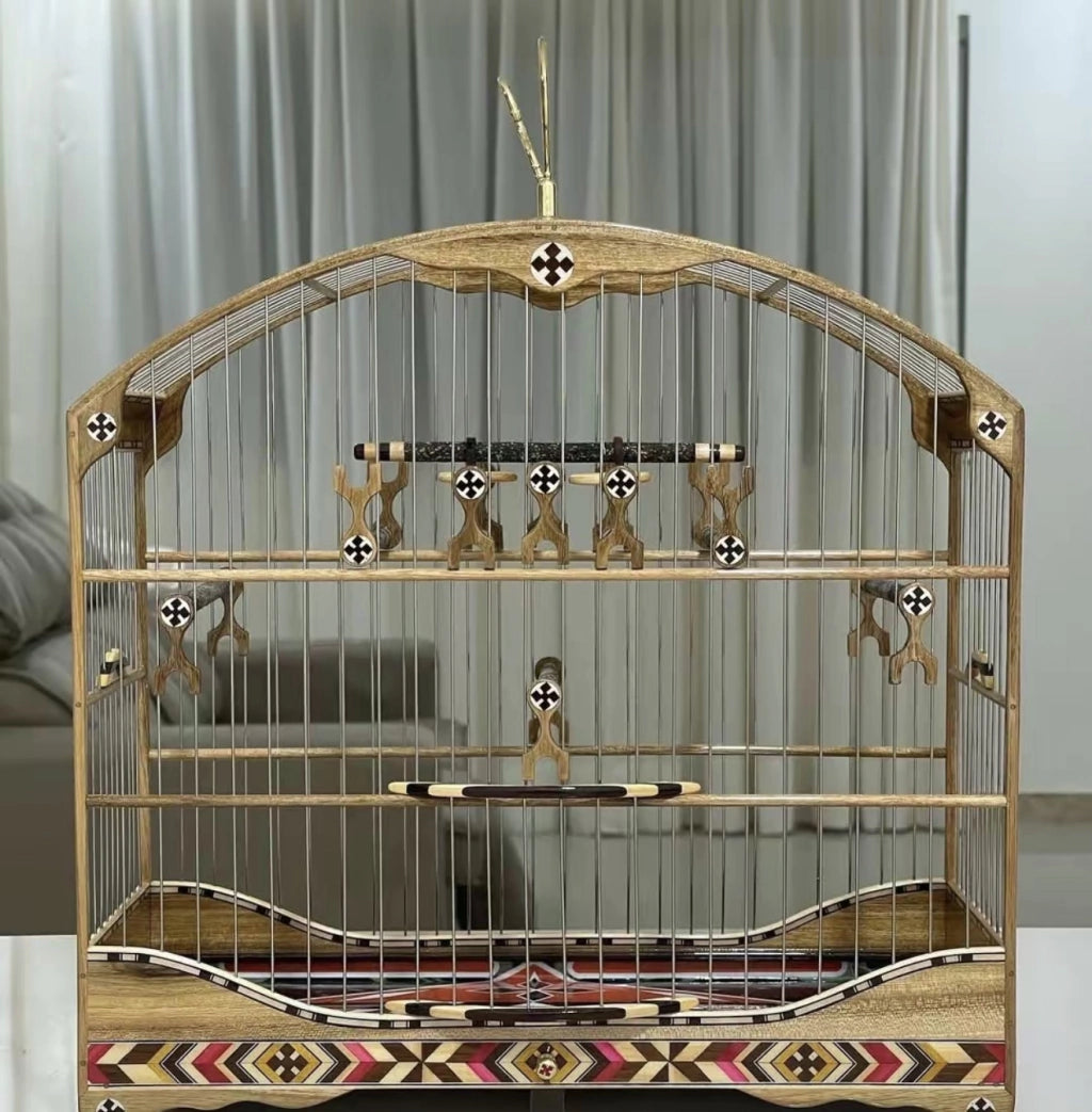 Feita em madeira nobre clara com marchetaria artesanal colorida, essa gaiola entrega elegância, leveza e presença — ideal para quem quer se destacar em torneios ou exposições.